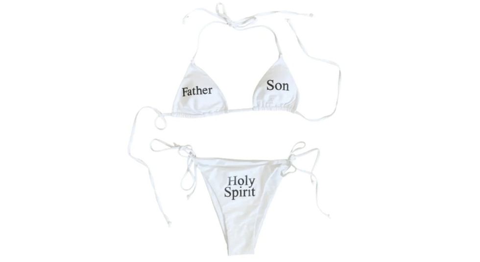Whether one is religious or not, a Christian or not, and offended by the Holy Trinity bikini or not, it’s worth giving a thought to why this particular subversion of religious terminology feels problematic to so many, and, indeed, why so many feel it’s within their rights to play judge. Some would say that’s God’s job.