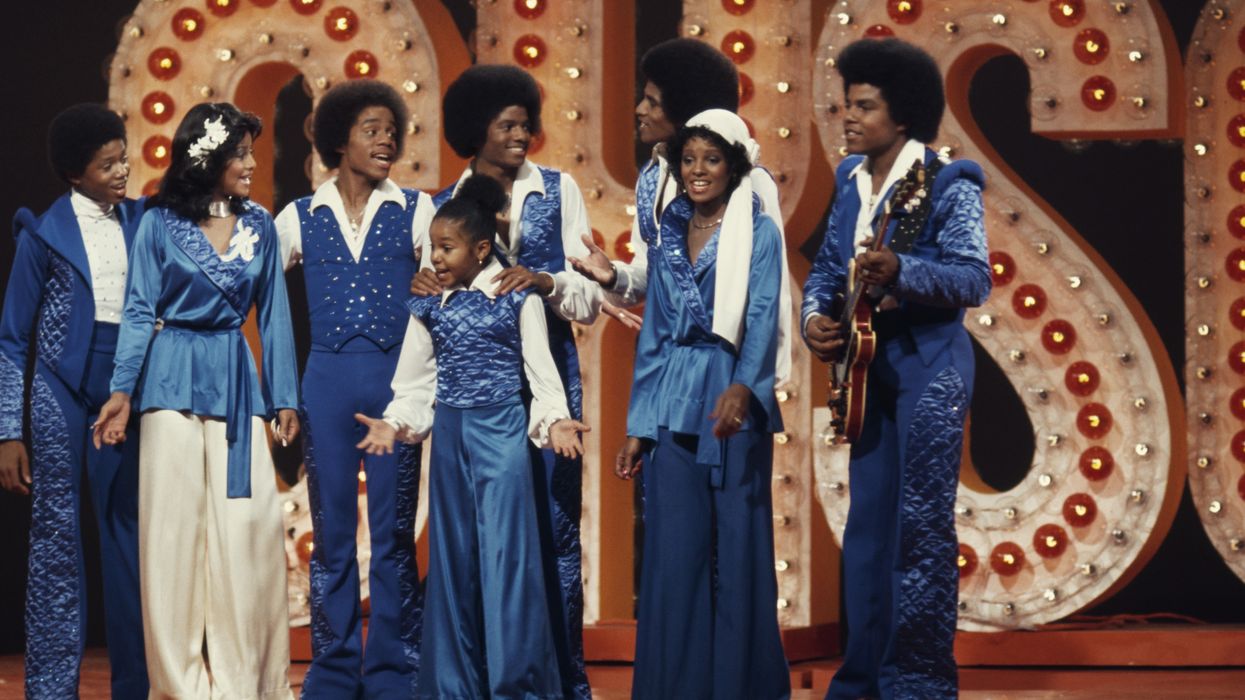 The Jackson family film a tv show at Burbank Studios, California, 13th November 1976. From left to right, Randy, La Toya, Marlon, Janet, Michael (1958 - 2009), Jackie, Rebbie and Tito.